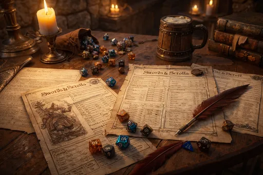 Swords and Scrolls is a Roleplaying Game written by Adrian Sweeney and John Bankhead in 1996. It was written to make running and playing a roleplaying game more fun and realistic, for example, if a user takes longer at a task as in taking their time then they get a bonus for their activity,